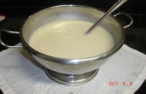 Modo de fazer:Coloque a carne numa panela com 1 1/2 l. de água, para fazer um caldo de carne. Deixe ferver bem. Enquanto isso, em outra panela, coloque a manteiga, deixe derreter e acrescente a cebola picada em pedaços grandes, deixe fritar e depois coloque a farinha, mexa até começar a dourar. Acrescente o caldo de carne o sal e deixe ferver, mexendo de vez enquando até que a cebola esteja bem cozida. Passe tudo por uma peneira, acrescente o leite e deixe ferver. Sirva com queijo parmesão ralado e torradas.